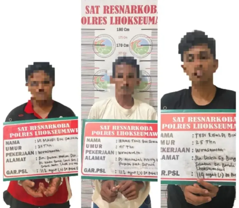 Kapolres Lhokseumawe, AKBP Henki Ismanto, SIK melalui Kasat Re Narkoba, Iptu Jeffryandi mengatakan, tersangka yang ditangkap yakni TR (25) warga Kota Lhokseumawe, IT (32) warga Kabupaten Bireuen dan MM (46) warga Kota Lhokseumawe.