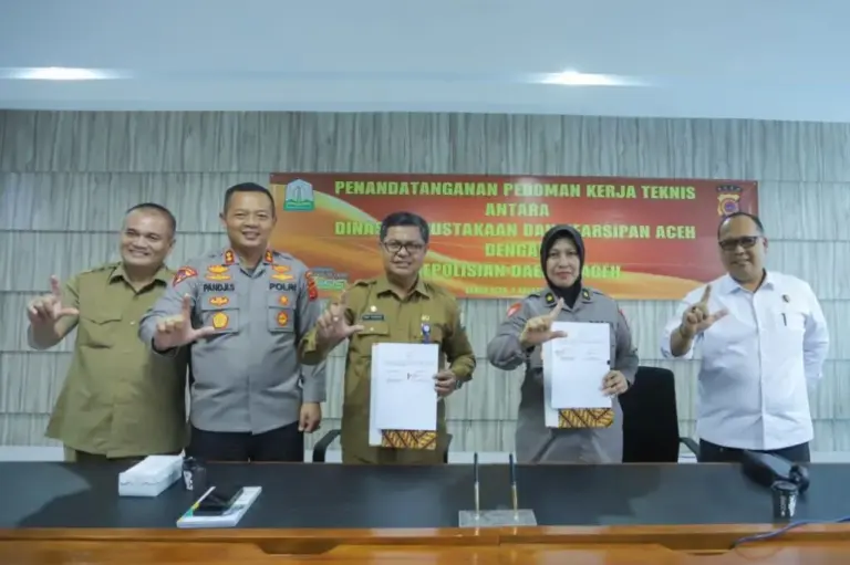 SIGNALNEWS.CO | Banda Aceh – Polda Aceh dengan Dinas Perpustakaan dan Kearsipan Aceh (DPKA) teken MoU atau kerjasama pedoman kerja teknis di aula Pustaka Wilayah Aceh, Senin, 7 Agustus 2023.