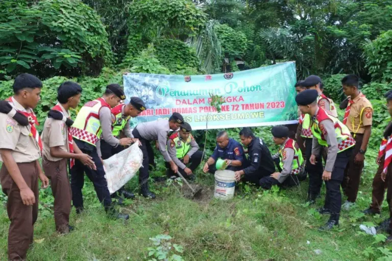 Penanaman Pohon melibatkan seluruh Anggota Humas Polres Lhokseumawe, Kbo Sabhara beserta anggota. Kegiatan ini juga mengikut sertakan puluhan anggota pramuka saka Bhayangkara sebagai bentuk edukasi dan semangat menggaungkan gerakan penghijauan di tengah pemanasan global.