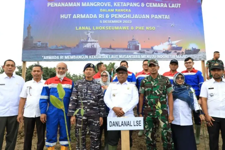 SignalNews.co | Lhoksukon -Komandan Pangkalan TNI Angkatan Laut (Lanal) Lhokseumawe dan Penjabat Bupati Aceh Utara Dr Mahyuzar, MSi, dan sejumlah pejabat lainnya menanam ribuan pohon di tepian pantai Gampong Matang Puntong Kecamatan Seunuddon Kabupaten Aceh Utara, Rabu, 6 Desember 2023.