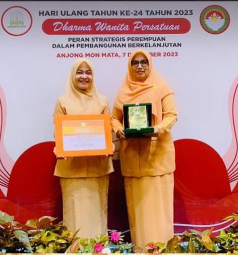 SignalNews.co | Banda Aceh – Ketua Dharma Wanita Persatuan (DWP) Kabupaten Aceh Utara menerima Piagam Penghargaan dan Plakat juara 1 (satu) pada kegiatan Hari Ulang Tahun (HUT) Dharma Wanita Persatuan ke-24 di Anjong Mon Mata, Kamis, (7/12/2023).
