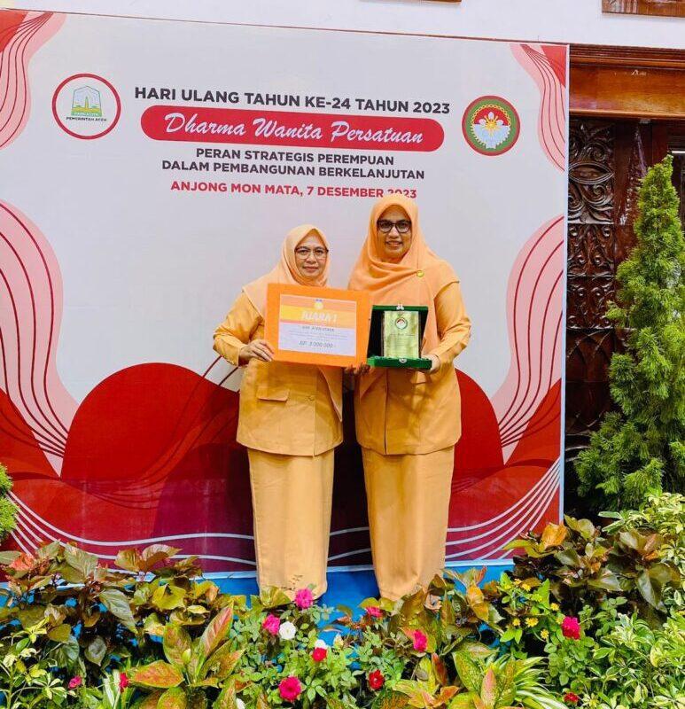 SignalNews.co | Banda Aceh – Ketua Dharma Wanita Persatuan (DWP) Kabupaten Aceh Utara menerima Piagam Penghargaan dan Plakat juara 1 (satu) pada kegiatan Hari Ulang Tahun (HUT) Dharma Wanita Persatuan ke-24 di Anjong Mon Mata, Kamis, (7/12/2023).
