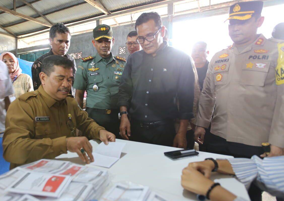 SignalNews.co | Lhokseumawe – Pj Walikota Lhokseumawe A Hanan, bersama dengan sejumlah unsur Forkopimda, tinjau proses penyortiran dan pelipatan surat suara di Gudang Logistik Komisi Independen Pemilihan (KIP) Kota Lhokseumawe. Kehadiran Pj Walikota dalam kunjungan ini bertujuan untuk memastikan kesiapan logistik pemilihan yang akan dilaksanakan Februari mendatang. Senin (08/01/2024).