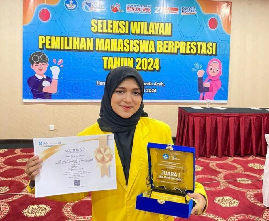 Banda Aceh | Mahasiswi Politeknik Negeri Lhokseumawe (PNL) kembali menoreh prestasi, kali ini Wasliyatul Hasanah yang merupakan mahasiswi Jurusan Teknik Kimia Prodi Migas berhasil meraih juara pertama jenjang Diploma dari ajang Seleksi Wilayah Mahasiswa Berprestasi Tahun 2024 yang diadakan 2-4 Mei 2024 di Hermes Palace Hotel, Banda Aceh.