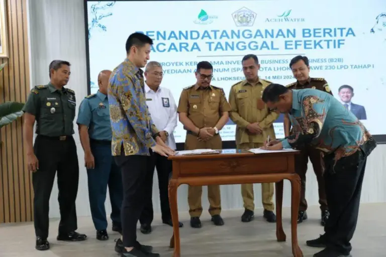 Lhokseumawe | Pj Walikota Lhokseumawe A Hanan, SP, MM memimpin acara penandatanganan Tanggal Efektif Pengembangan kerjasama proyek Sistem Penyediaan Air Minum (SPAM) Kota Lhokseumawe antara PDAM Ie Beusaree Rata Kota Lhokseumawe dengan PT. Toya Perdana Lhokseumawe. Acara tersebut berlangsung di Aula Setdako Lhokseumawe pada Selasa (14/05/2024).