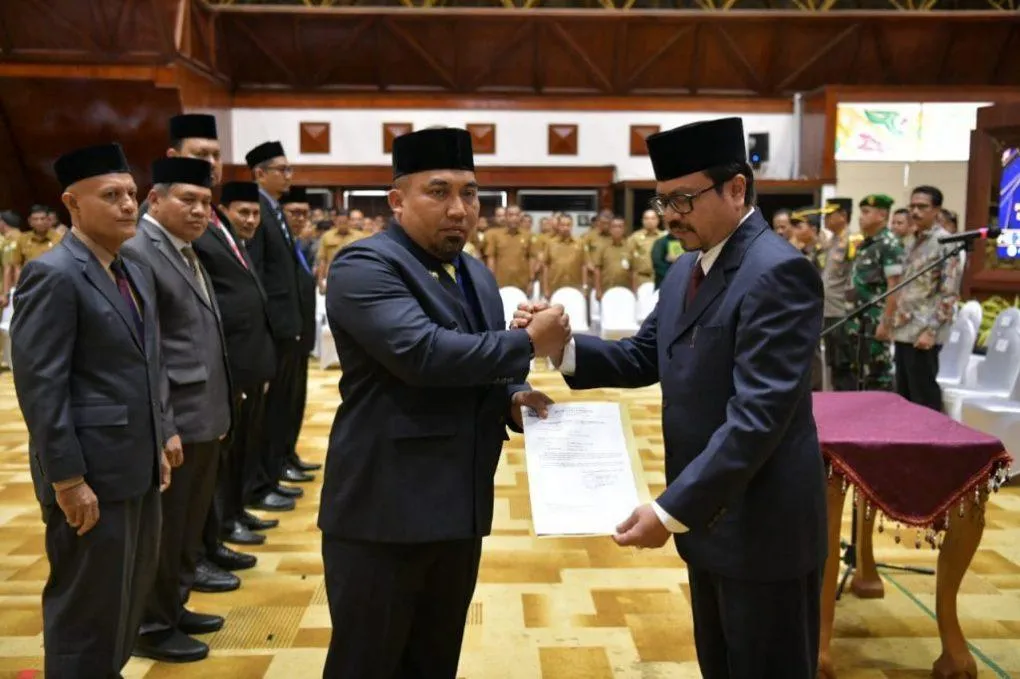 Prosesi pengambilan sumpah jabatan dan pelantikan dipimpin oleh Pj Sekda Aceh Azwardi, atas nama Gubernur Aceh, di Anjong Mon Mata komplek Meuligoe Gubernur Aceh, Selasa (21/5/2024).