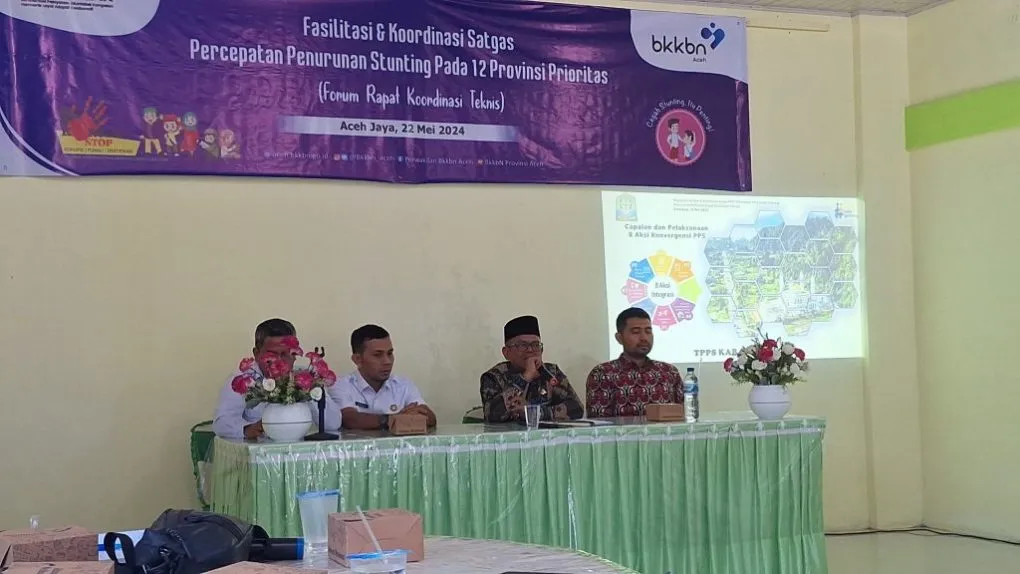 ACEH JAYA | Pemerintah Kabupaten Aceh Jaya bersama Perwakilan Badan Kependudukan dan Keluarga Berencana Nasional (BKKBN) Provinsi Aceh menggelar Rapat Koordinasi Teknis Percepatan Penurunan Stunting di Kabupaten Aceh Jaya. Acara ini berlangsung di Aula Mina, Calang, pada Rabu (22/5/2024).