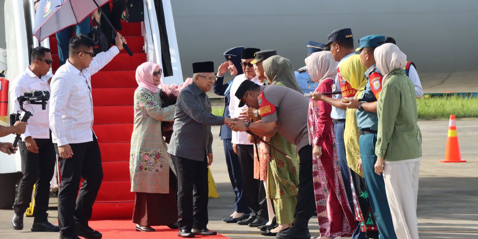 JANTHO | Kapolda Aceh Irjen Achmad Kartiko bersama Forkopimda menyambut kedatangan Wakil Presiden (Wapres) RI K.H. Ma’ruf Amin beserta Ibu Hj. Wury Ma’ruf Amin di Bandara Sultan Iskandar Muda (SIM), Kabupaten Aceh Besar, Rabu, 29 Mei 2024.