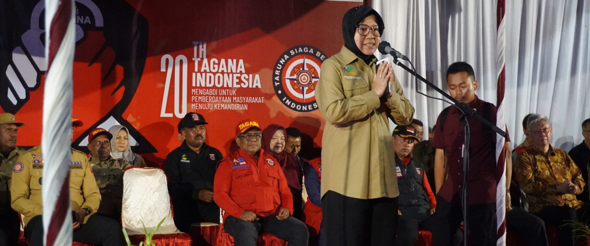 Dalam pidatonya, Risma mengungkapkan rasa terima kasihnya kepada seluruh anggota Tagana atas dedikasi dan kerja keras mereka selama 20 tahun dalam membantu masyarakat yang terdampak bencana.