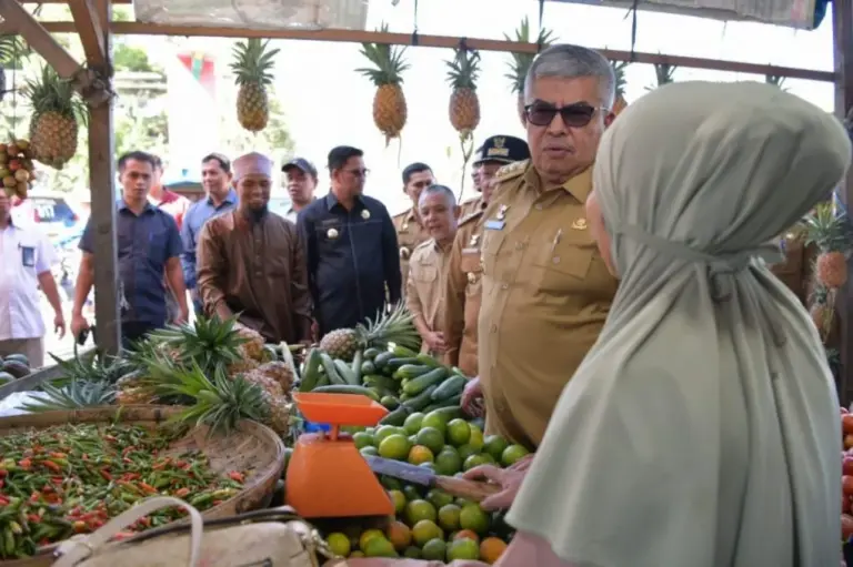 Usai pembukaan pasar murah, Pj Gubernur juga meninjau geliat Pasar Paya Ilang dengan mengunjungi sejumlah lapak pedagang buah dan sayur. Bustami tampak berinteraksi dengan para pedagang dengan menanyakan kondisi penjualan mereka.