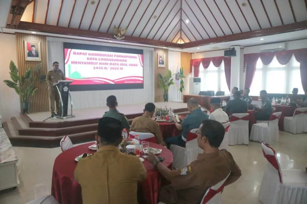 LHOKSEUMAWE | Menjelang Hari Raya Idul Adha 1445 H, Pemerintah Kota (Pemko) Lhokseumawe bersama unsur Forum Koordinasi Pimpinan Daerah (Forkopimda) menggelar Rapat Koordinasi (Rakor). Penjabat (Pj) Wali Kota Lhokseumawe A Hanan memimpin jalannya Rakor tersebut, yang diselenggarakan di Aula Kantor Wali Kota Lhokseumawe, Senin (10/6/2024).