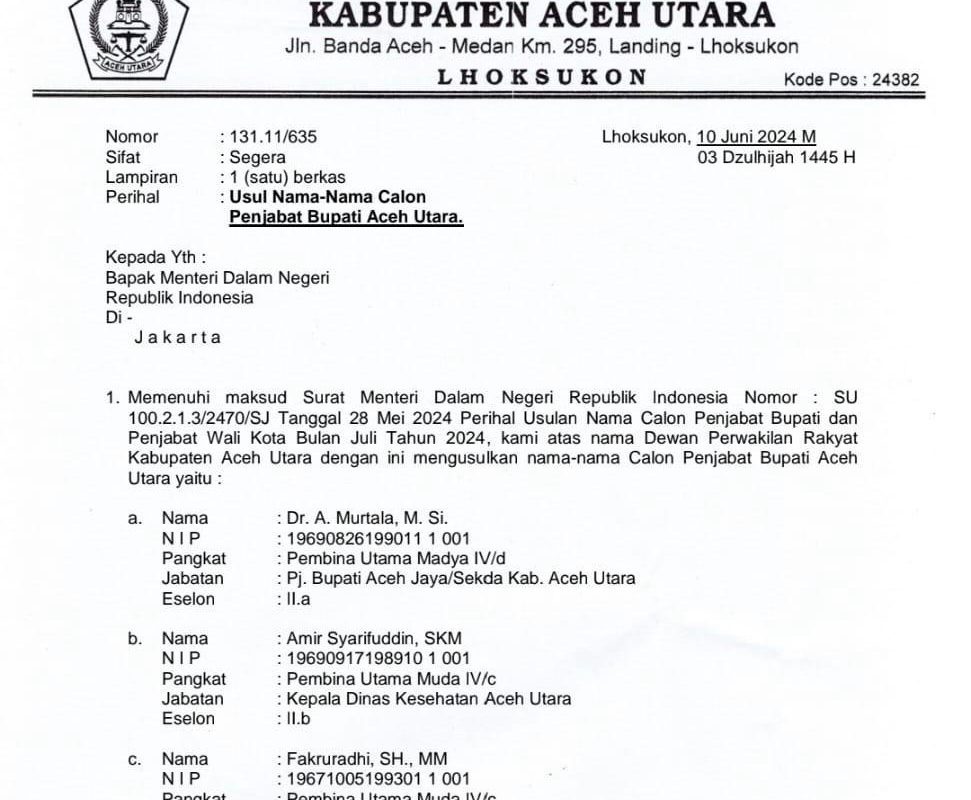 Menidak Lanjutin Surat Tersebut Dewan Perwakilan Rakyat Kabupaten(DPRK) Aceh Utara pada tanggal 10 Juni 2024 Nomor 131.11/635 mengirimkan Balasan Kepada Menteri Dalam Negeri mengusulkan 3 calon Penjabat Bupati Aceh Utara.