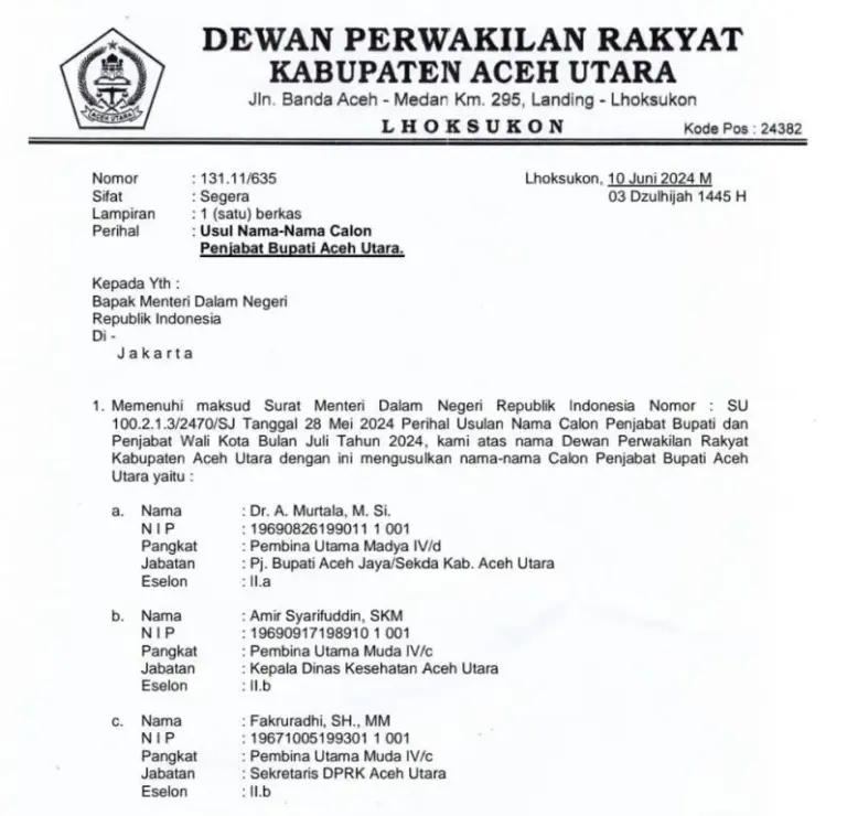 Menidak Lanjutin Surat Tersebut Dewan Perwakilan Rakyat Kabupaten(DPRK) Aceh Utara pada tanggal 10 Juni 2024 Nomor 131.11/635 mengirimkan Balasan Kepada Menteri Dalam Negeri mengusulkan 3 calon Penjabat Bupati Aceh Utara.