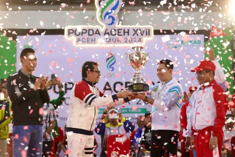 IDI | Pj Gubernur Aceh yang diwakili oleh Pj Sekretaris Daerah Aceh, Azwardi menyerahkan piala bergilir gubernur kepada kontingen Kota Banda Aceh sebagai juara umum Pekan Olahraga Pelajar Daerah (Popda) XVII Aceh Timur.