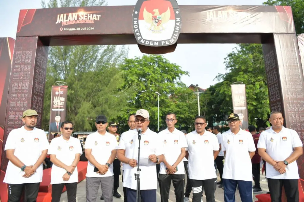 BANDA ACEH | Pj Gubernur Aceh Bustami, melepas ribuan peserta jalan sehat Pilkada Aceh 2024 yang digelar Komisi Independen Pemilihan (KIP) Aceh, di Taman Ratu Safiatuddin, Minggu, (28/7/2024). Para peserta jalan sehat menempuh rute sekitar 2 kilometer, dengan start dan finish di Taman Ratu Safiatuddin.