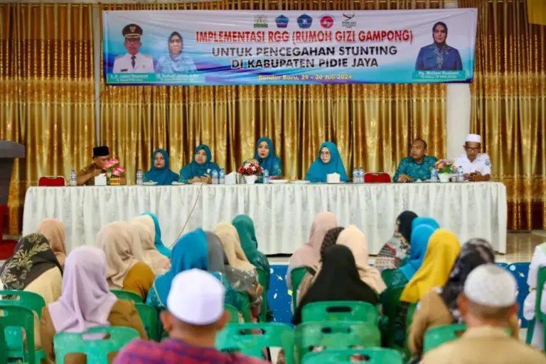 MEUREUDU | Pj Ketua PKK Aceh, Mellani Subarni, mendorong upaya penurunan stunting di Kabupaten Pidie Jaya, melalui Implementasi Rumoh Gizi Gampong (RGG) yang berlangsung di Kantor Camat Bandar Baru, Pidie Jaya, Senin (29/7/2024). Mellani menekankan pentingnya RGG sebagai model intervensi yang terintegrasi, untuk pencegahan dan penanganan stunting di tingkat gampong.