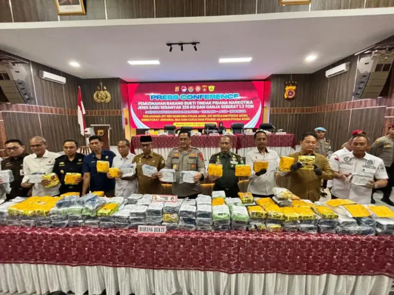 BANDA ACEH | Polda Aceh melaksanakan pemusnahan barang bukti berupa sabu 226 kg dan ganja 1,2 ton hasil pengungkapan Ditresnarkoba dan Polres jajaran tiga bulan terakhir. Pemusnahan itu berlangsung di depan Aula Presisi Polda Aceh, Selasa, 6 Agustus 2024.