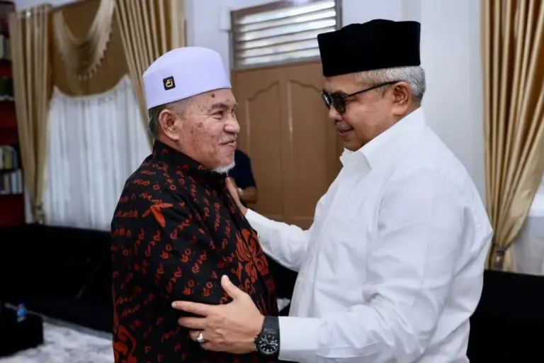 BIREUN | Penjabat Gubernur Aceh Bustami Hamzah, bersilaturrahmi ke kediaman Ulama Karismatik Aceh pengasuh Dayah Ma’hadal Ulum Diniyah Islamiyah Tgk H Hasanoel Bashry, Minggu (18/8/2024).