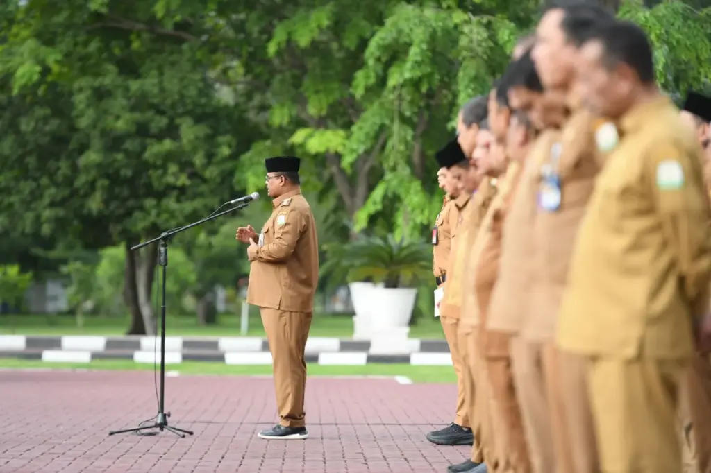 Foto: Penjabat Gubernur Aceh, Dr. H. Safrizal ZA, M.Si., memimpin Apel Senin yang diikuti seluruh Pejabat Eselon II, III dan IV juga ASN dilingkungan kantor gubernur, di Lapangan Upacara Kantor Gubernur, Senin, 14/10/2024