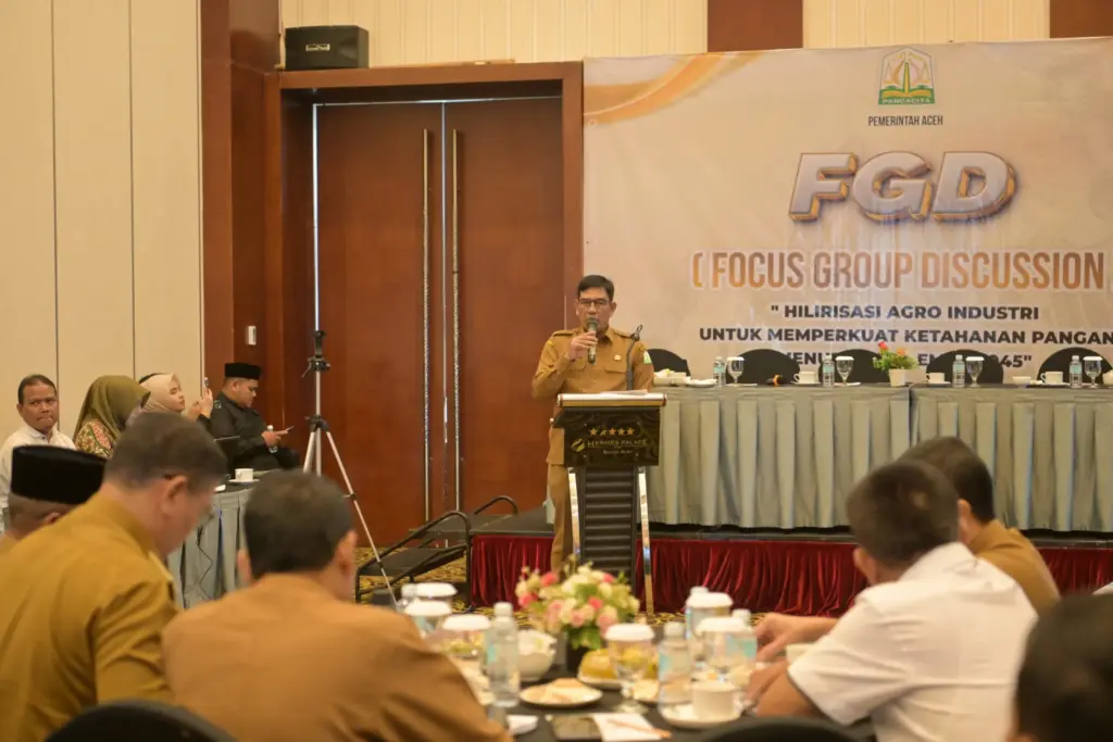BANDA ACEH | Pelaksana Tugas Sekretaris Daerah Aceh, Muhammad Diwarsyah, membuka Focus Group Discussion (FGD) bertema “Hilirisasi Agroindustri untuk Memperkuat Ketahanan Pangan Menuju Aceh Emas 2045” di Hermes Palace Hotel, Senin (2/12/2024).