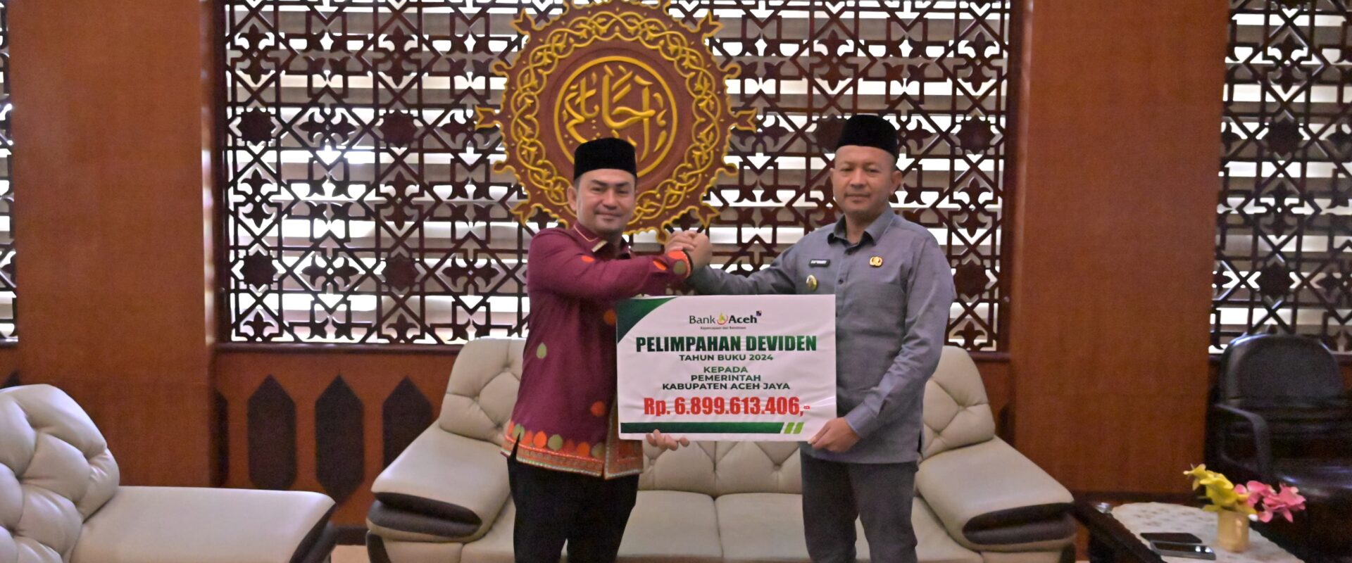 ACEH JAYA | Bupati Aceh Jaya, Safwandi, S.Sos., menerima deviden Tahun Buku 2024 dari Bank Aceh Syariah Cabang Calang senilai Rp 6.899.613.406 di Ruang Kerja Bupati Aceh Jaya pada Jumat, 21 Maret 2025.