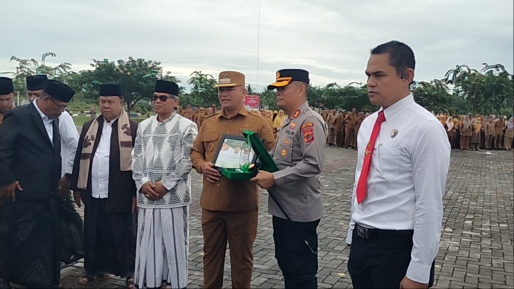 Penyerahan penghargaan dilaksanakan setelah apel gabungan di lapangan upacara Kantor Bupati Aceh Utara, Senin (15/9/2025).