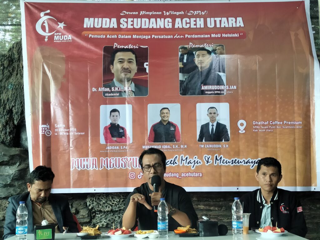 Aceh Utara | Dewan Pimpinan Wilayah (DPW) Muda Seudang Aceh Utara melaksanakan kegiatan diskusi interaktif bertema “Persatuan dan Perdamaian MoU Helsinki untuk Penguatan Wawasan Kader Muda Seudang”, Senin, 20 Oktober pukul 14.00 WIB di Gathaf Kupi, Aceh Utara.