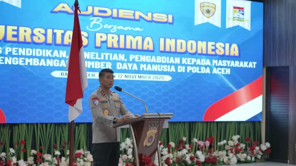 Banda Aceh — Kapolda Aceh Irjen Pol. Drs. Marzuki Ali Basyah didampingi Wakapolda Brigjen Pol. Ari Wahyu Widodo serta para pejabat utama, menerima audiensi dari civitas akademika Universitas Prima Indonesia (UNPRI) Medan di Gedung Presisi Polda Aceh, Selasa, 11 November 2025.