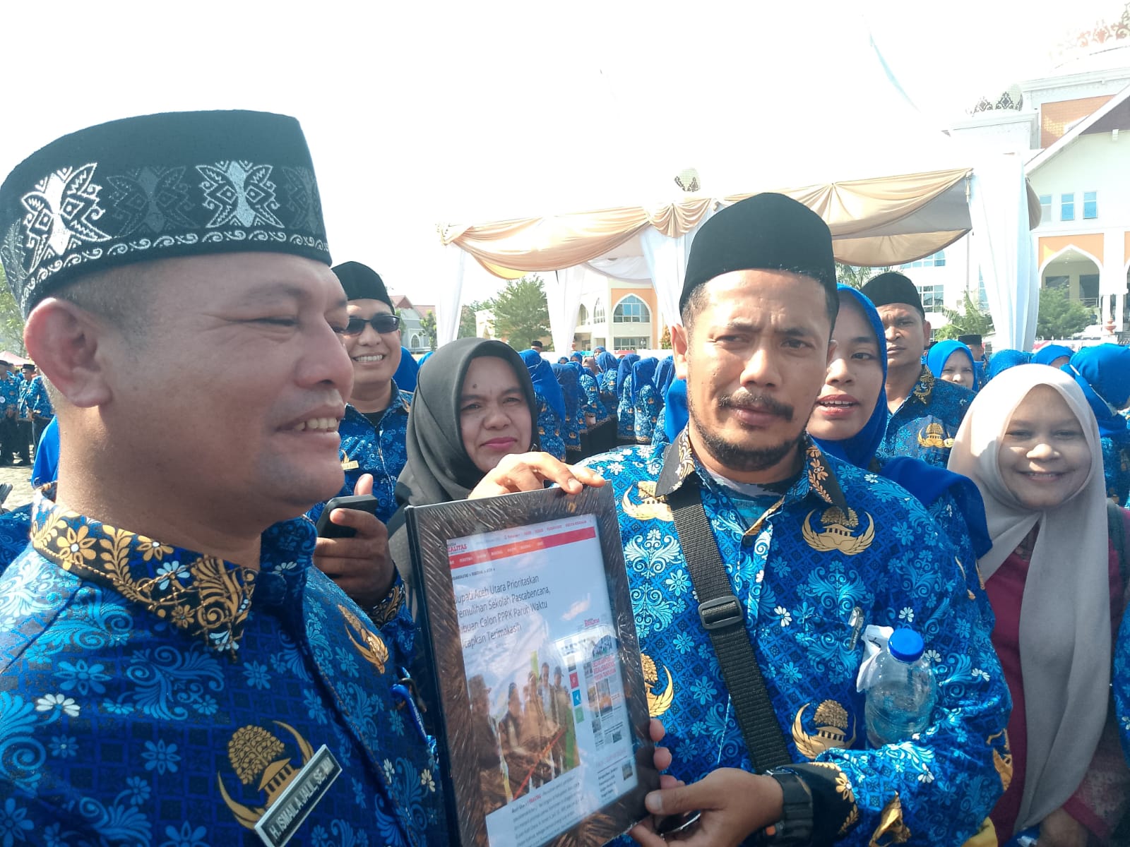 Di tengah kerumunan, Muhazir, S.Pd.I, seorang guru honorer SMPN 1 Seunuddon sekaligus jurnalis, menyerahkan cinderamata khusus kepada Ayahwa. Bingkai tersebut berisi dokumentasi pemberitaan saat bupati terjun ke lokasi banjir dan mendampingi Menteri Kemendikdasmen di SMAN 2 Seunuddon.