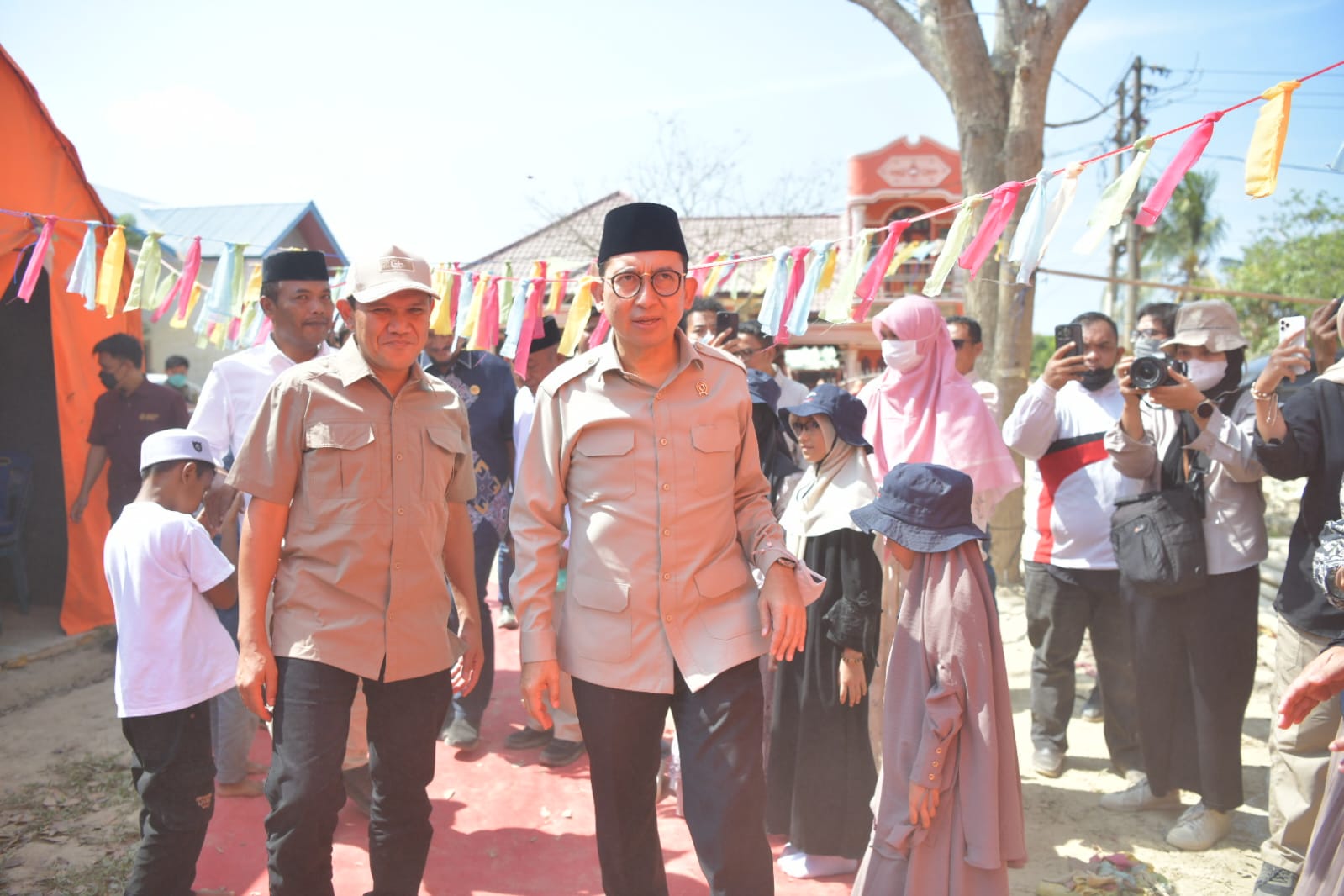Foto: Wakil Gubernur Aceh, Fadhlullah, SE bersama Menteri Kebudayaan RI, Fadli Zon, Bupati Aceh Tamiang, Armia Fadmi mengunjungi sekolah inspirasi bangsa program sahabat yatim, dialog singkat dan penyaluran bantuan kepada anak yatim di posko BNPB, Aceh Tamiang, Sabtu, 07/03/2026.